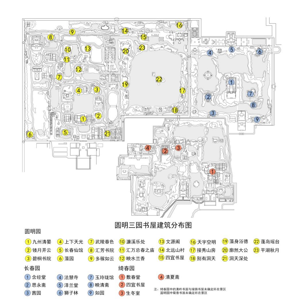 图3 乾隆时期圆明三园增设的书屋建筑分布图