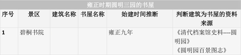 圆明三园中的书屋建筑在不同时期的数量和分布情况都会有所变化。本文结合圆明三园的发展将书屋建筑的营建过程分为四个时期:雍正时期、乾隆时期、嘉庆时期、道光咸丰时期。圆明三园中的建筑在雍正至咸丰时期一直不断进行扩建、重修、改建和修缮等工程,加上帝王对于不同景区和空间的喜爱程度不同,三园中的书屋建筑也会随之有所变化。根据相应的史料,可判断出三园中书屋的始建时间,但变迁过程相对复杂,需要进一步研究。因此,本文中圆明三园中的书屋营建历程主要是对各时期新建的书屋进行梳理。