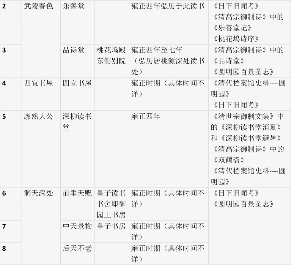 雍正时期,圆明园中的书院、书屋建筑一共有八处,分别为碧桐书院景区、武陵春色景区的乐善堂和品诗堂、四宜书屋景区的四宜书屋、廓然大公景区的深柳读书堂以及洞天深处景区的前垂天贶、中天景物和后天不老等(表1-1和图2)。
