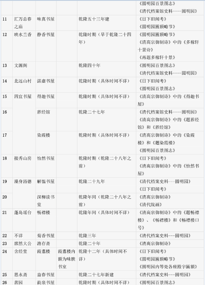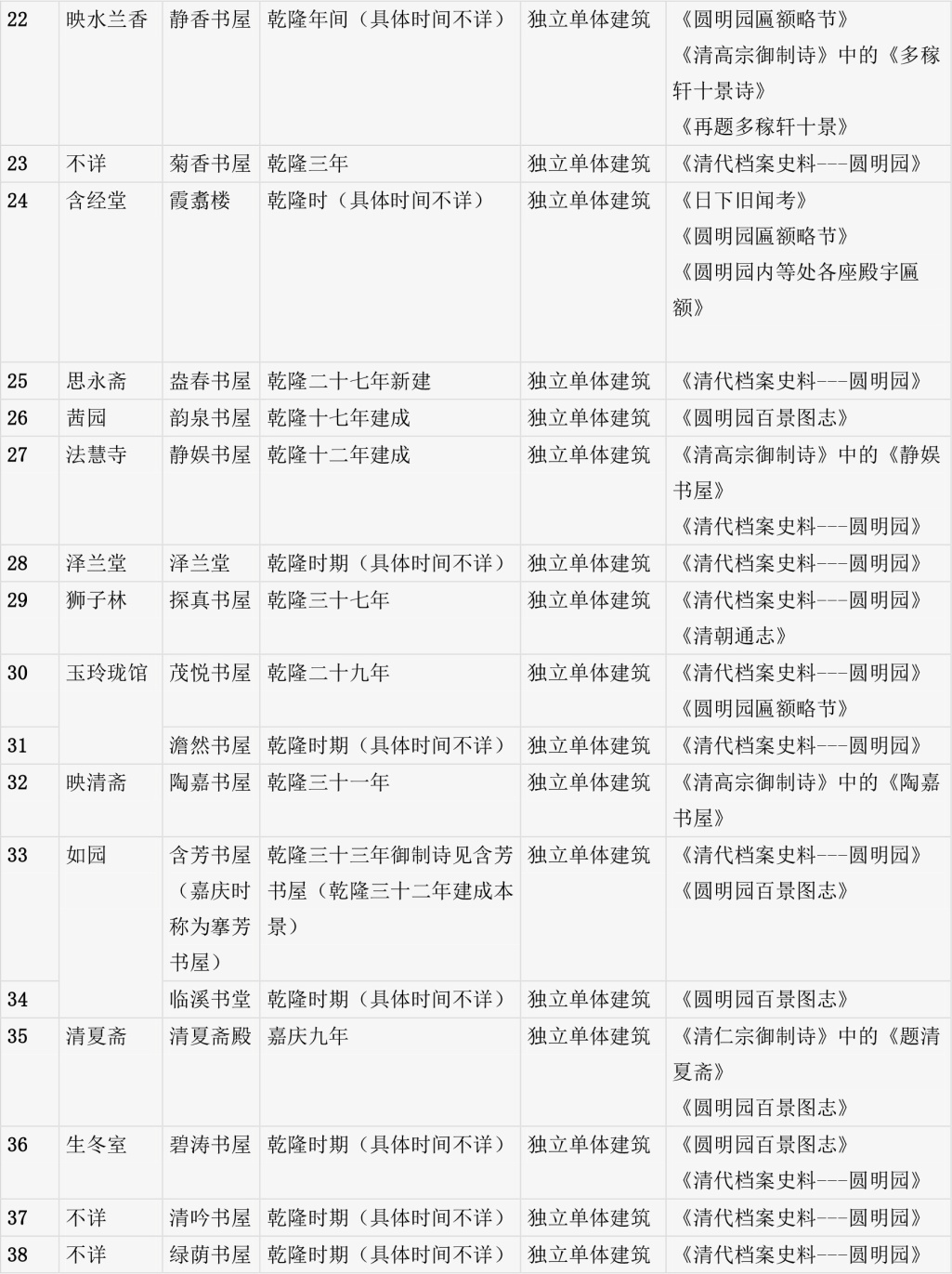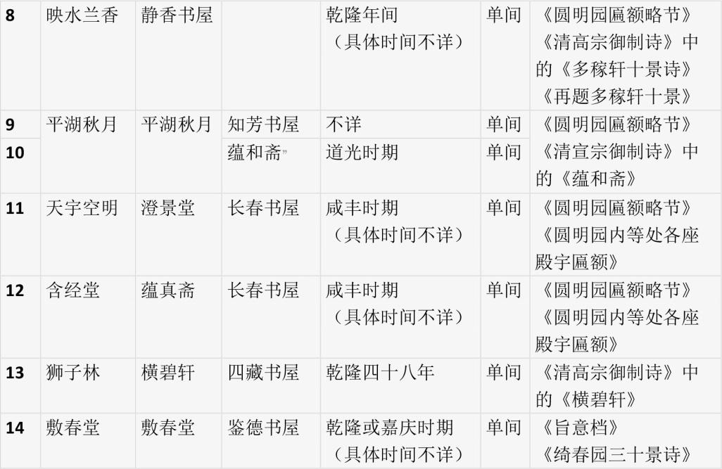 (表格来源:作者根据《清代档案史料---圆明园》、《圆明园百景图志》、《日下旧闻考》《圆明园匾额楹联通解》和清帝王御制诗文以及样式雷档案图等资料整理)