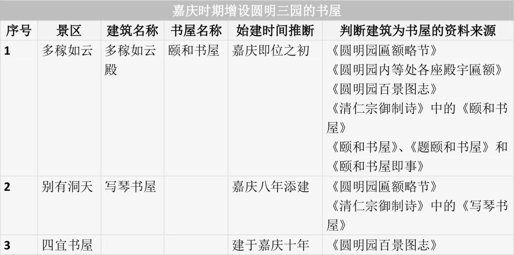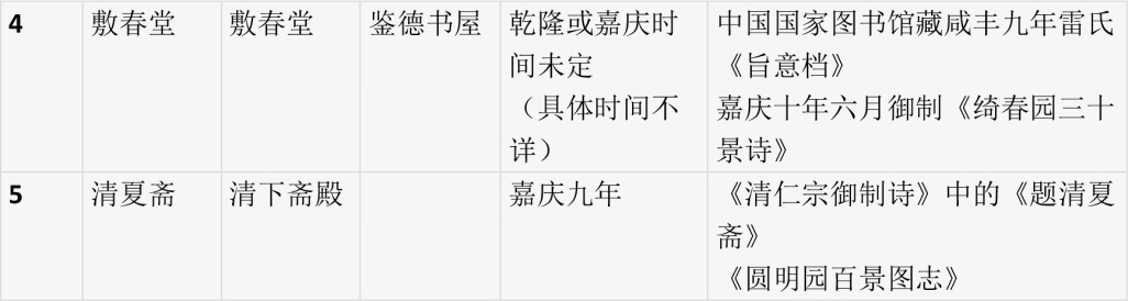 与乾隆时期相比,嘉庆帝在位期间在圆明三园中添建书屋的数量相对较少,根据历史资料的记载整理可知,嘉庆时期圆明三园中的增设书屋建筑一共有五处:颐和书屋、写琴书屋、四宜书屋、鉴德书屋和清夏斋殿(表1-3和图4)。