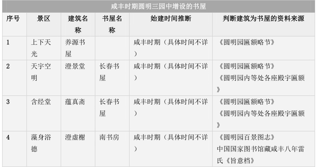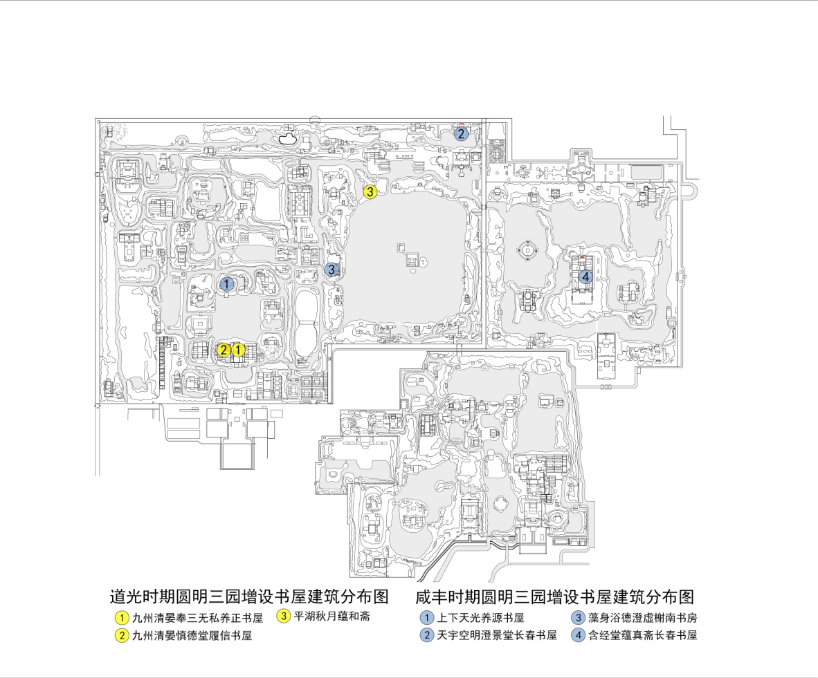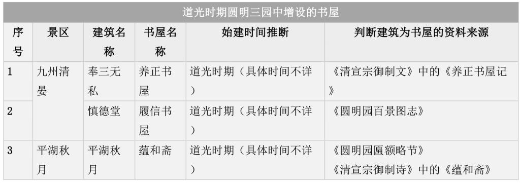 道光咸丰时期圆明三园中的书屋只有少量的增加。道光时期,在圆明园的九州清晏景区设置了三处书屋:奉三无私殿的养正书屋、平湖秋月的蕴和斋和慎德堂的履信书屋。咸丰时期,咸丰帝增设了四处书屋:上下天光景区的养源书屋、澡身浴德澄虚榭的南书房、天宇空明景区澄景堂的长春书屋和含经堂景区蕴真斋的长春书屋(表1-4、1-5和图5)。