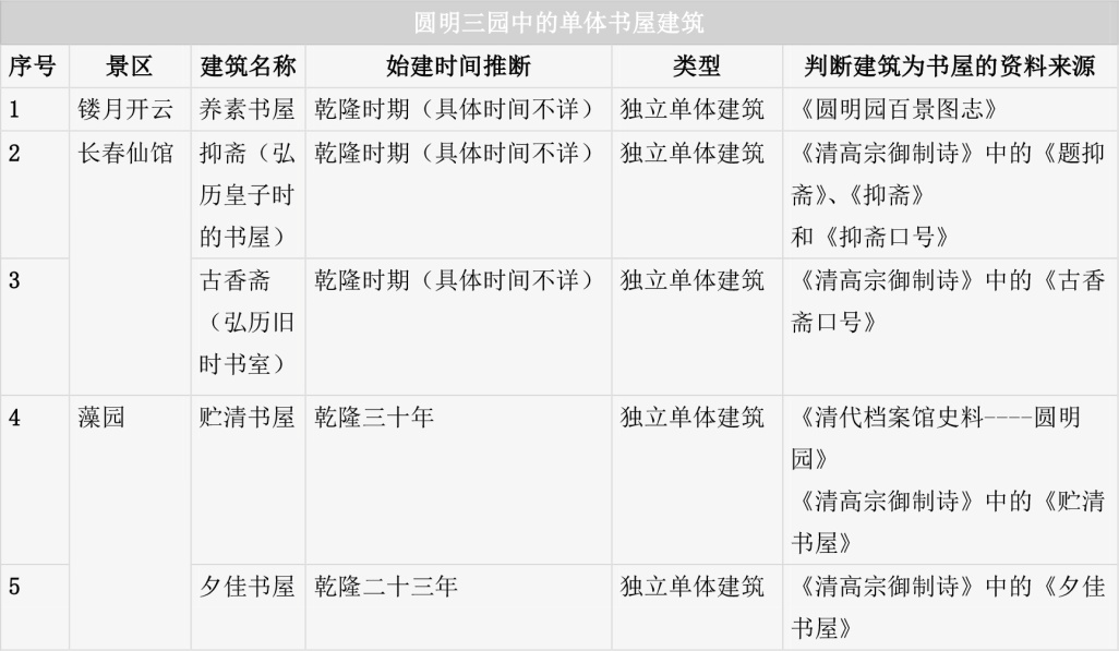 圆明三园中的书屋的建筑空间类型有两大类:一是书屋建筑群,二是单体书屋建筑或单间书屋建筑。单体书屋建筑或单间书屋建筑又进一步分为单体书屋建筑和单体建筑中的单间或多间书屋。根据资料整理可知,圆明三园中建筑群为书屋有五处:圆明园四处,绮春园一处;单体书屋建筑有三十八处:圆明园有二十二处,长春园有十一处,绮春园有四处;单体建筑中的单间书屋有十四处:圆明园有十一处,长春园有两处,绮春园有一处。