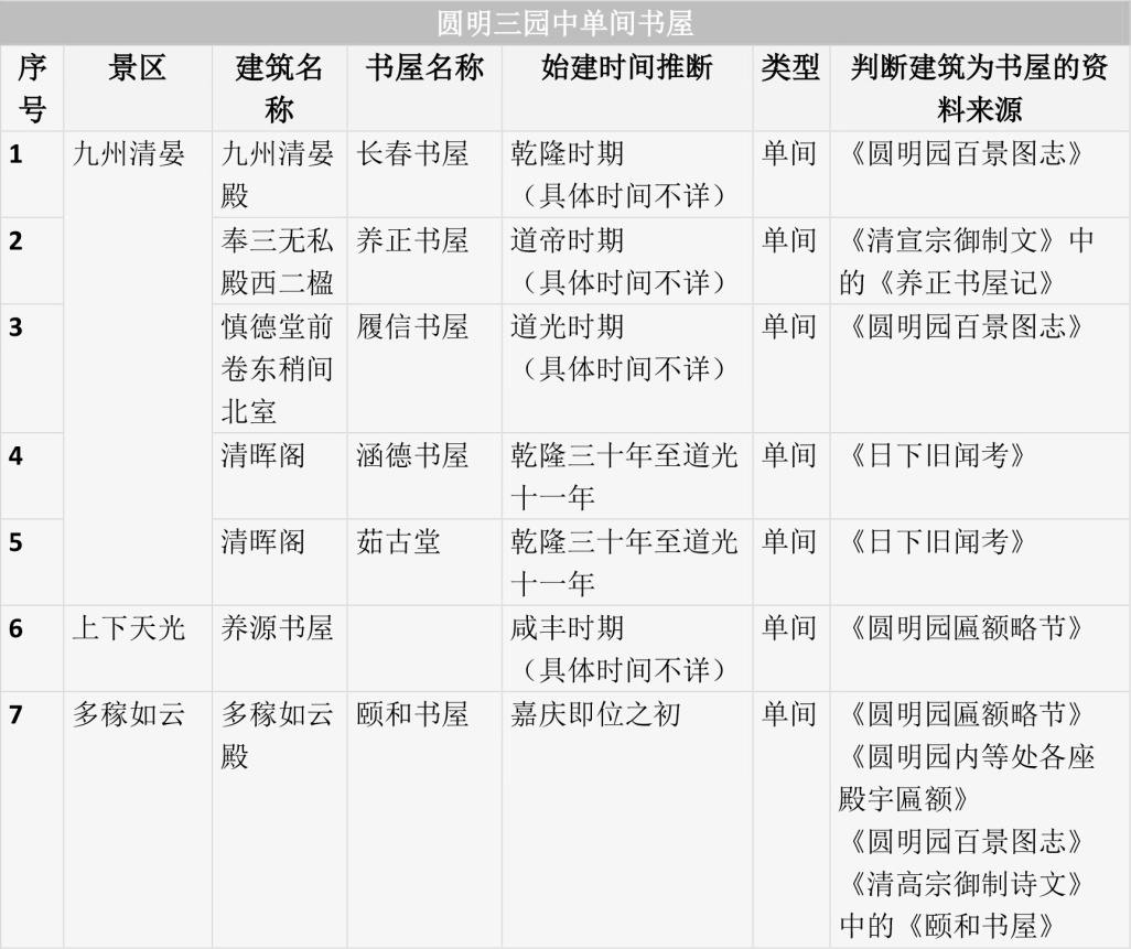 圆明三园中单间书屋即为圆明三园部分景区中某座建筑中的一间或几间设置为书屋。此类书屋常常设置在卧室之旁或殿堂的别室,满足皇帝、皇子和妃嫔可以在日常生活闲暇之余读书的需求。此类书屋建筑在圆明三园中共有十四处,圆明园有十一处:分别是九州清晏殿的长春书屋、奉三无私殿的养正书屋、慎德堂殿的履信书屋和清晖阁殿的涵德书屋、茹古堂;上下天光景区中上下天光殿的养源书屋、多稼如云景区中多稼如云殿的颐和书屋、天宇空明景区中澄景堂殿的长春书屋,平湖秋月的知芳书屋和蕴和斋;长春园有两处:含经堂景区蕴真斋殿的长春书屋、狮子林景区橫碧轩殿的四藏书屋;绮春园有一处:敷春堂景区敷春堂殿的鉴德书屋(表1-8)。