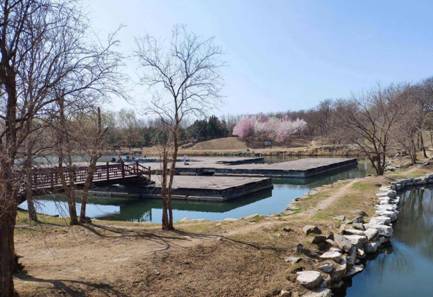 三园之中圆明园主要为四十景园林建筑群,也是本文研究对象所处的地点。根据查阅的资料与现场调研补充,目前圆明园中复原展示的主要内容为遗址复建与标识展示。下图为圆明园坦坦荡荡中遗址复建的现状情况,但现场只对金鱼池遗址进行了整体梳理,恢复了假山的基本布局。碧澜桥按照国际文物保护标准进行了复建,但景区护栏依然为现代形制(图1)。