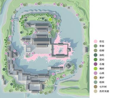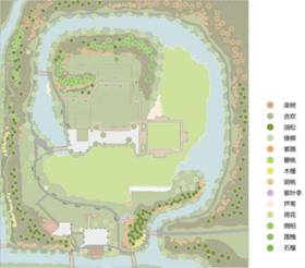 根据《圆明园内工则例》中花果树木价值表的记载[[9]]与《圆明园植物景观复原图说》的相关历史考证[[10]],最后依照四十景图总结了濂溪乐处的植物空间布局:濂溪乐处整体植物以大面积荷花为主,水岸周围种植山桃与旱柳,形成空间引导与色彩搭配,局部种植黄栌、石榴以点缀;在中心岛慎修思永建筑群与南部汇万总春之庙建筑群中种植圆柏、油松、七叶树等寓意万古长青与宗教性质的植物,将亭台楼阁掩映在虚实的山石空间之中;在中心岛建筑周边搭配梧桐、国槐等大体型的遮荫乔木,形成层次丰富的植物景观空间,着重体现乾隆后期濂溪乐处的田园宁静悠然与君子谦逊高洁之意(图8)。