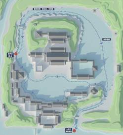 濂溪乐处位于圆明园西北部,根据穿戴档记载,乾隆经常乘坐游船沿着圆明园内部水系到达此处进行游玩与休憩。濂溪乐处外围都有与周围景区连通的桥梁,内部都可以沿岸进行徒步观景;北部慎修思永建筑群与南部汇万总春之庙建筑群都设有配殿与连廊进行连接,南北部围墙都设有小门,可以自由穿梭,整体流线便捷通畅。
