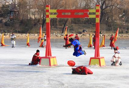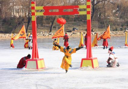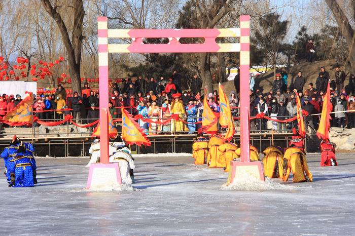 第三届圆明园皇家庙会期间,五十余名专业滑冰运动者进行冰嬉表演。表演人员穿着清朝八旗服饰,分场次在圆明园凤麟洲冰面上进行花样溜冰及冰上杂技的表演,并进行各种冰嬉布阵,重现清代绘画《冰嬉图》实景。这里,游庙会的皇帝与百姓一同观看冰嬉,欢庆龙年的到来,给游客带来了深刻的印象。“冰嬉”是清代冬季练兵、寓教于乐的一项重要活动,曾被乾隆皇帝定为“国俗”。最盛大时有1600名冰上高手同时表演,场面异常雄伟,故宫博物院现藏的乾隆年间国宝《冰嬉图》记载了当时的表演盛况。