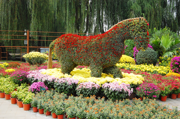 另外,圆明园内水面众多,圆明园因势利导,将这一长处利用起来,去年凤麟洲水面70平米的“水上花园”一出现就令人眼前一亮,成为众多游客争先拍照的焦点。今年圆明园把水上花景增加到三个,在凤麟洲、鉴碧亭、松风萝月水面,用矮牵牛、菊花、鸡冠花、雏菊等常见花,精心搭配成别致的花岛。远远望去,如远离尘嚣的世外桃源,相当有意境。今年金秋节的圆明园菊花,像这样有创意的亮点处处可见,共计十余个菊花观赏点,或是主题花坛美轮美奂,或是花卉互动增加体验,或是花境小品精致多变。或含苞欲放,或盛开吐蕊,与其它各种秋季草花一起,组成圆明园秋季流香溢彩、美不胜收的视觉盛宴。今年圆明园响应节俭办节、低碳环保的理念,其中许多花境小品是利用园内的植物材料如竹子、枯枝等,通过各种巧妙构思的搭配组合设计成而,不但节约了成本,更形成别致的意境。