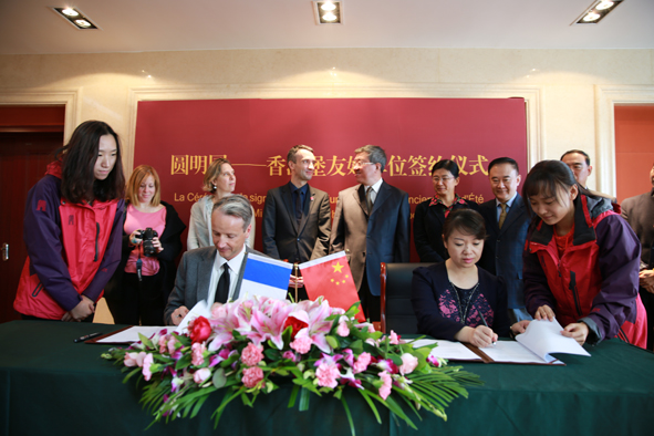 参观结束后,中法来宾进行了热烈的座谈交流,同时,圆明园管理处与香波堡管理处正式签订了合作协议,今后双方将在文化遗产保护、展示以及文化产业发展等多方面展开交流与合作。圆明园与香波堡都是18世纪的皇家园林,也是世界著名的文化遗产,是两国文化发展的见证者。圆明园将法国香波堡作为中国首次官方合作的国外历史遗迹,此次结盟旨在增强中法两国人民对这两处历史遗迹的认识,让两国游客了解文化与自然遗产的保护措施。同时,双方将通过发展旅游业,激励和支持中法两国文化、教育和科学等领域的沟通,并努力发展音乐、园林整治、遗产保护等方面的共同项目。