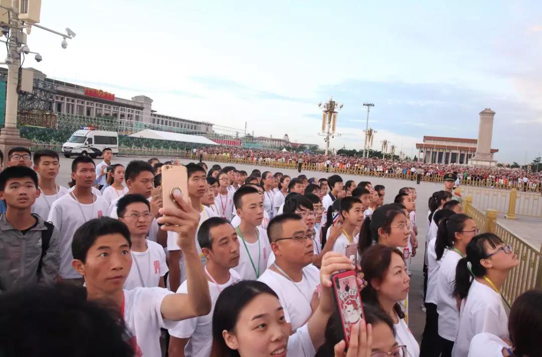 孩子们在天安门广场观看升旗仪式。在庄严的国歌中,鲜艳的五星红旗迎着初升朝阳冉冉升起,同学们神情肃穆,向国旗行注目礼。