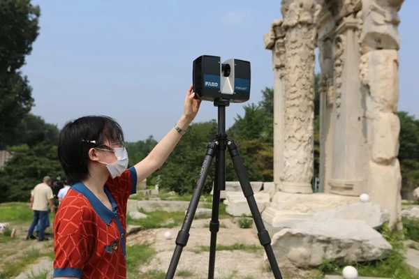 7月22日,北大考古文博学院工作人员在圆明园遗址上进行三维扫描。