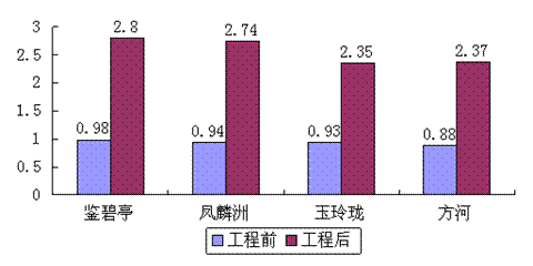 由图6得出水质的评价看出,鑑碧亭、凤麟洲、玉玲珑馆、方河的生物多样性指数都有较大幅度的增加,均从小于1上升到2以上。按多样性指数法评价,鑑碧亭、凤麟洲、玉玲珑馆、方河水质都比修复前的重度污染有了较大的改善,尤其鑑碧亭和凤麟洲指数已接近于3,表明水质基本属于清洁程度。