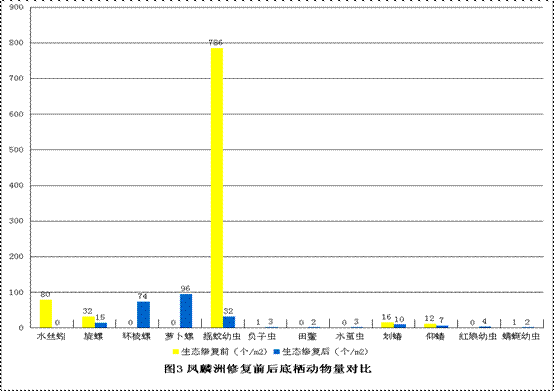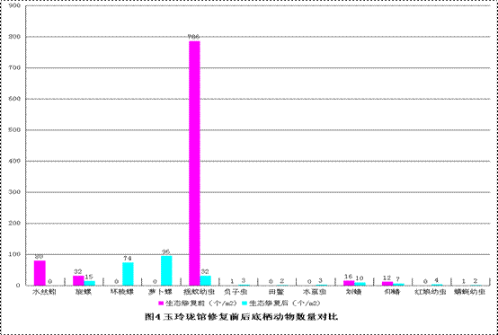 水生态修复后,摇蚊幼虫和水丝蚓的数量均大大减少。水丝蚓能在有机污染最严重的地方生存下来。水丝蚓生活在底泥中,藏身于黏液和泥土作成的软管中。如同陆生蚯蚓摄食泥土中的有机物,通过肛门排泄蚓粪。摇蚊幼虫是淡水水域中底栖动物的主要类群之一,据一般估计,摇蚊的种类大约可占湖泊生物区系的25%。个体数量常极为众多,栖息密度每平方米达到5万只幼虫的情况并不少见,因而成为水域生物量的重要组成部分。由于主要以水底有机物碎屑为食,且摄食量相当可观,因而在加速水体物质循环中的有机物矿化作用和消除有机物污染方面具有显著作用。摇蚊科昆虫又因种类丰富,个体众多,不同种类对水域生境要求不同,从而成为监测水体环境和污染状况的优良指示生物,在生态学和环境科学领域中得到广泛的应用。摇蚊幼虫和水丝蚓个体虽小,但总体数量却极大,故其摄食的总量是相当可观的。摇蚊幼虫和水蚯蚓能够通过吞食大量藻类来净化水体,并可通过分解湖水中有机物降低生化需氧量;另一方面,水中有机物被摇蚊幼虫和水蚯蚓摄食后,一部分分解为植物可吸收的营养无机盐类,加速水体中物质循环的有机物矿化作用。因此可以认为,摇蚊幼虫和水丝蚓对于改善四湖的生态系统起到了不可或缺的作用。