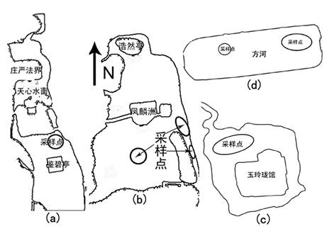 图1 实验采样点分布 (a)鑑碧亭(b)凤麟洲(c)玉玲珑馆 (d)方河