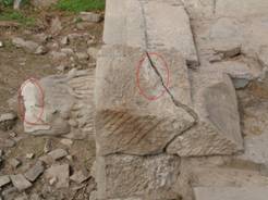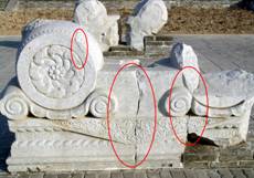 (3)机械损伤:主要指在外力作用如撞击、倾倒、跌落等因素的影响下,发生的石质文物断裂与残损,局部缺失。任何断裂破碎的构件,只要能拼起来,无论破损到什么程度,都应尽可能挽救。因为这些构件上承载的历史、文化信息,一旦丢弃就无法挽回。