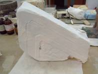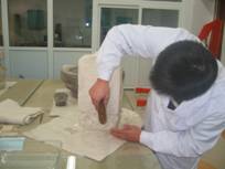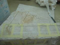 对这三件文物脱盐我们使用了贴敷吸附法。这种方法能够延长水与石质文物表面的接触时间,同时降低水的渗透深度,能够有效清除岩石本身及清洗过程中所产生的可溶盐,不会损伤石质。吸附材料内水分的蒸发使所溶解的物质(主要是盐)析出,而沉积在其表面。根据石质文物本体不同的状况,我们选取了两种吸附材料宣纸和纸粉调成的纸浆,用去离子水湿润吸附材料。用排笔蘸取去离子水将湿润的宣纸或纸浆贴敷在文物表面,使纸张与文物紧密相贴,石质中的溶盐会在石质文物毛细作用和纸张纤维纹理的协同抽吸作用下进入纸张糊敷层,纸层干翘后留在纸层纤维中,此时揭下纸层。如此反复进行了3次。