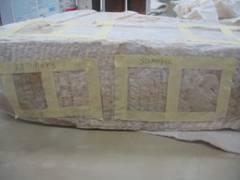 清洁石材表面。表面必须无尘、油脂、青苔及松散的颗粒。表面预湿。其中在涂sanofix之前,表面必须充分湿润。使用软刷用清水湿润表面直至表面可明显地保持较长时间的湿润。基本配方:Sanofix与水以1:3的比例稀释。Remmers300直接使用。Sanofix与六烷基三甲基溴化铵分别按3%和5%的比例调配。涂刷过程:本次试验均采用涂抹方法。Sanofix如果在涂刷过程中有许多泡沫,则可用水稀释加以解决。Remmers300如果过饱和,可用酒精清洗,以防表面固化改变石材表面质感。