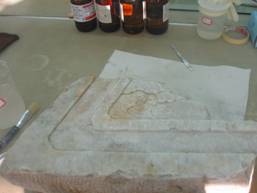 由于附着在文物表面的油漆较厚,先用刻刀进行机械剥除,清除至接近石质表面时,改用手术刀剥除,再用超声波清洗仪清除。在清理接近石材表面沉积物时,鉴于沉积物颗粒较细,且多已侵入石质多孔性材质中,使用EDTA配合碳酸铵用脱脂棉糊敷的方法分解软化,再进行清洗处理。