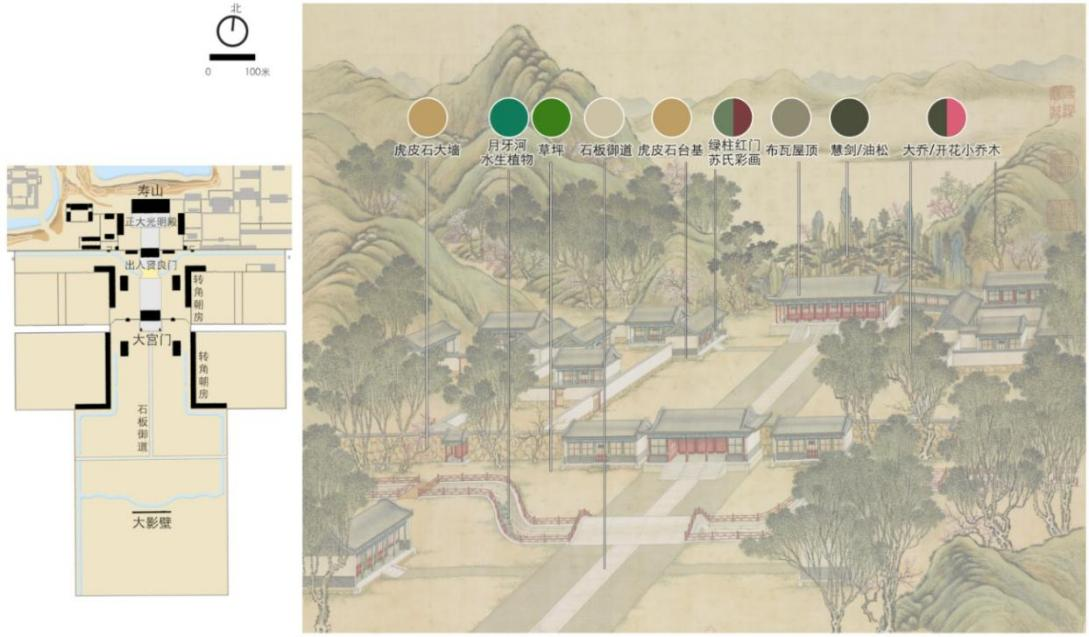 从视觉上,规则的建筑布局带来了秩序与层次感,这里与皇宫相比更令人感到亲近,但也不失肃穆与威严(图2-1)。根据相关绘画,园林化体现在大片绿地和水系在外朝区的运用,大料石驳岸的河流起到了排水功能,也为水生植物的栽种提供了空间;落叶乔木、开花小乔木集中在中轴线两侧的平地或土山上;石板和海墁的硬质铺装范围被限制在中轴线上的御路及附近的支路。