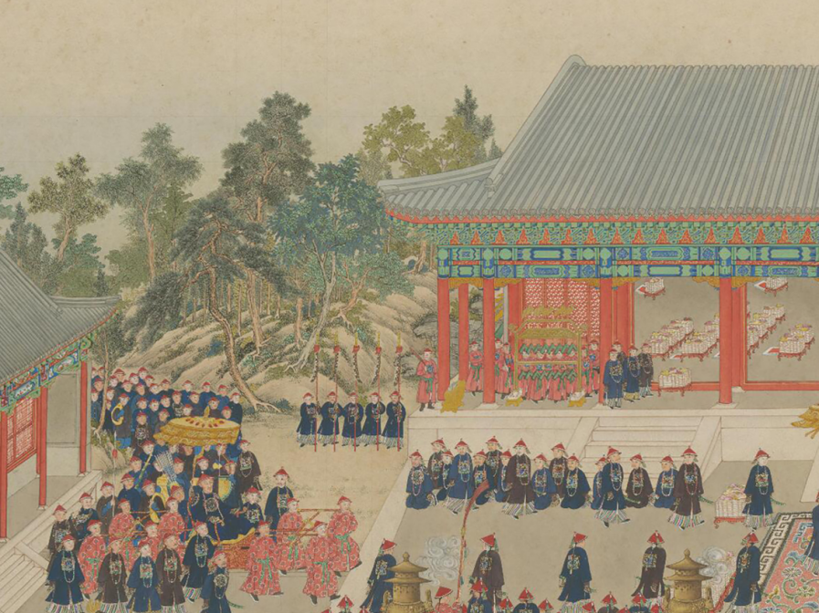 正大光明殿背倚寿山,山名取自“仁者寿”、“仁者乐山”,山上的繁茂大乔木与慧剑山石共同作为“万笏朝天”寓意的背景,与建筑单体构成了完整的构图,显示出了勃勃生机。道光时期的一幅赐宴图则清晰描绘了这样的景观效果,而在这样的环境中举办仪典,带给人的心理感受是略微轻松的,身体感受也会比较舒适(图3)。