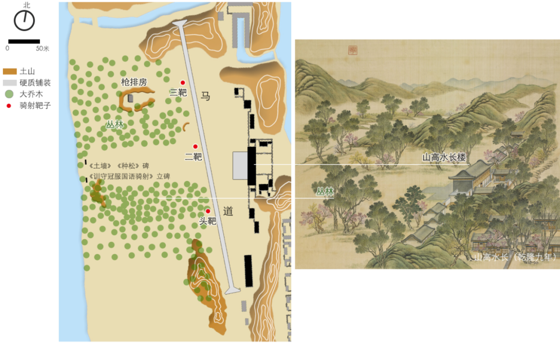 但这片场地既非一片白地,也不是像《四十景图》描绘的那样点缀有旱柳和桃花,风景优美。据样式房图档,道光时期这里建有一条73丈(约233.6米)的斜向跑马道和三个骑射靶子,作为重要的演武设施,马道背后则是大片的丛林及贯穿南北的长河,林中还堆筑有几座小土山,这些造景元素搭配起来似乎是在模拟满洲先祖赖以栖居的森林与河流(图11)。
