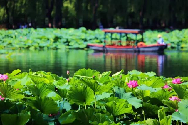 乘舟泛湖游览绮春园、长春园、曲院风荷、濂溪乐处等景区均可欣赏碧粉荷景。千余亩荷塘的二百余种各式荷花,令人应接不暇,特别是长春园开辟了水上观荷路线,泛舟湖面,令人心旷神怡。