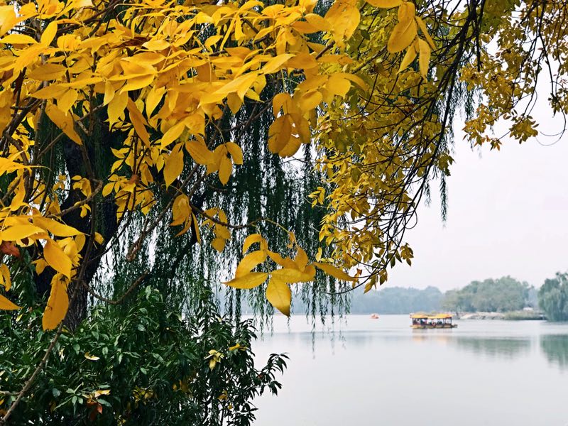 深秋的圆明园,水在蓝天映衬下显得更蓝,树叶色彩也是更加斑斓。历史留下的各种姿态在秋日的美景里更显刚柔之美。