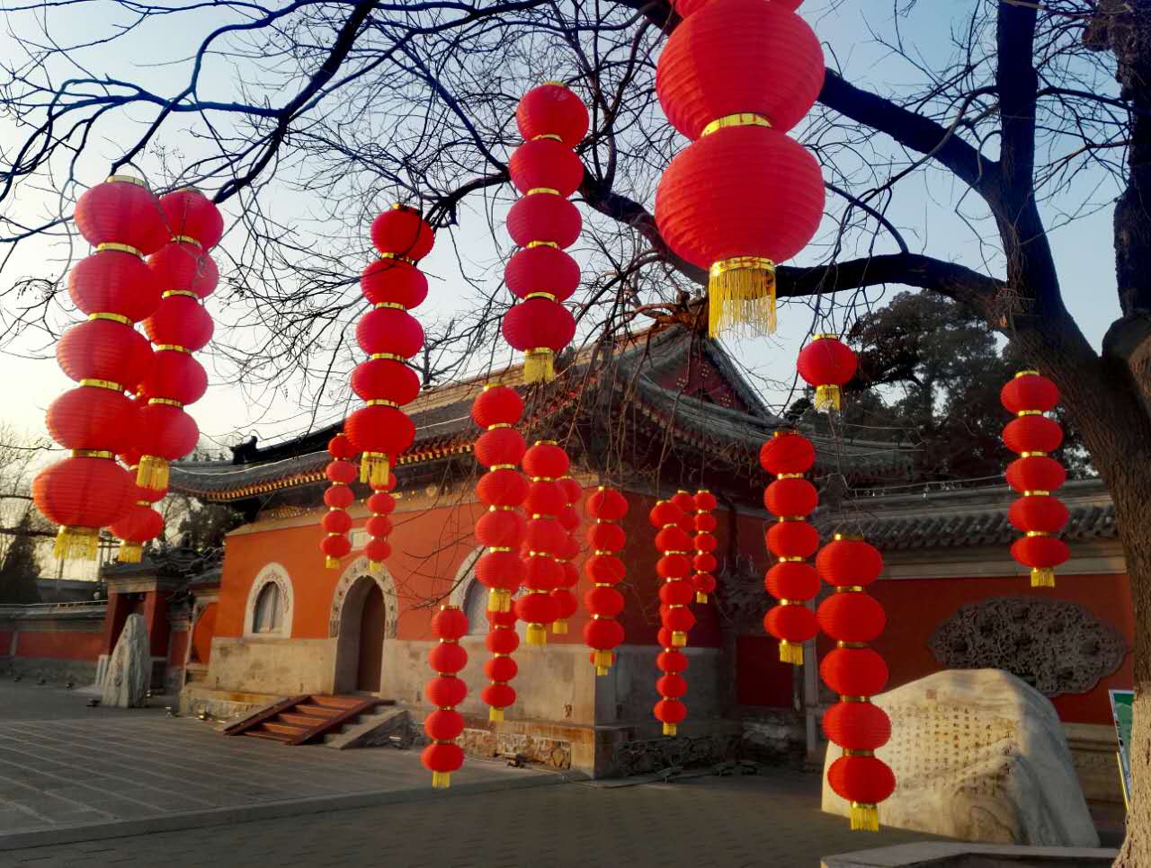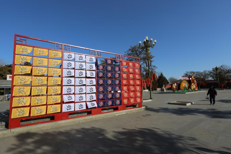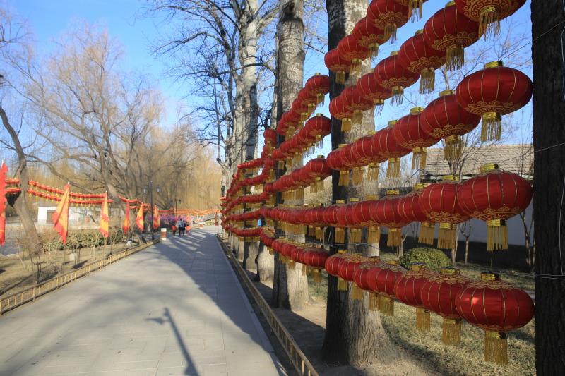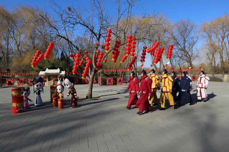 为迎接春节,营造喜庆祥和的冬季节庆氛围,我处进行了2018年春节园容布置。绮春园、长春园、圆明园主要游线以及各门区悬挂红灯笼;涵秋馆展台、绮春园福字门、鉴碧亭各设置一组清朝皇家风格的卡通人偶小品,“皇上”携“皇后娘娘”、“小阿哥”向游客作揖拜年。数百串火红的灯笼挂满树梢,充满年味、喜庆热闹的园林环境受到游客的喜爱,游客们纷纷在灯笼下、卡通小品前合影留念。园内的保卫工作人员将扮成八旗士兵在园内主游览路线巡游,同时派发新年小礼物与游客互动,与游客同游、同乐,共度新春。