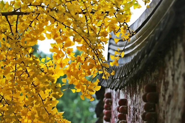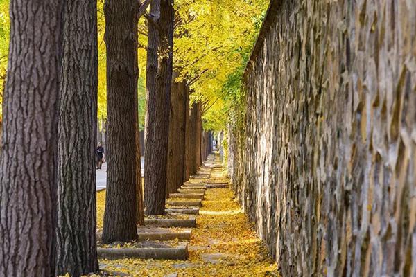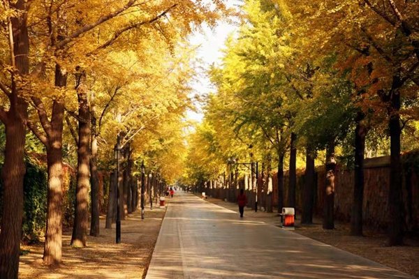 位于圆明园三园交界的银杏大道,是一条近千米的南北路,两侧种植着整齐的银杏树,树枝上的银杏叶和满地的落叶形成一条浪漫的黄金大道,而黄灿灿的银杏叶又和两侧围墙上红色的藤蔓相互映衬,美不胜收。11月上旬是圆明园银杏的最佳观赏期,为了给游客营造一个优美舒适的游园体验,圆明园缓扫银杏大道的落叶,满树都是金黄色,满地也是金黄色,走在厚厚的银杏叶上,脚下发出窸窸窣窣的声音,很有秋日到来的仪式感。