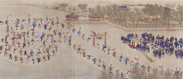 本次皇家冰嬉表演内容以故宫博物院《冰嬉图》中转龙射球为主,把冰嬉运动中最精华的部分展示给观众。这种技艺较高的冰上活动流行于古代宫廷,32-40名专业冰上展示队员身着清朝八旗将士服装,轮番登场展示冰上技巧。