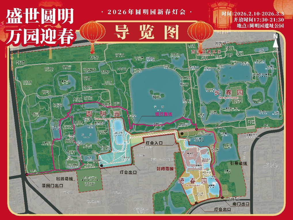 2026年2月10日至3月3日(腊月廿三至正月十五)圆明园举办“盛世圆明·万园迎春”2026年圆明园新春灯会,园内部分区域将采取临时管制措施: