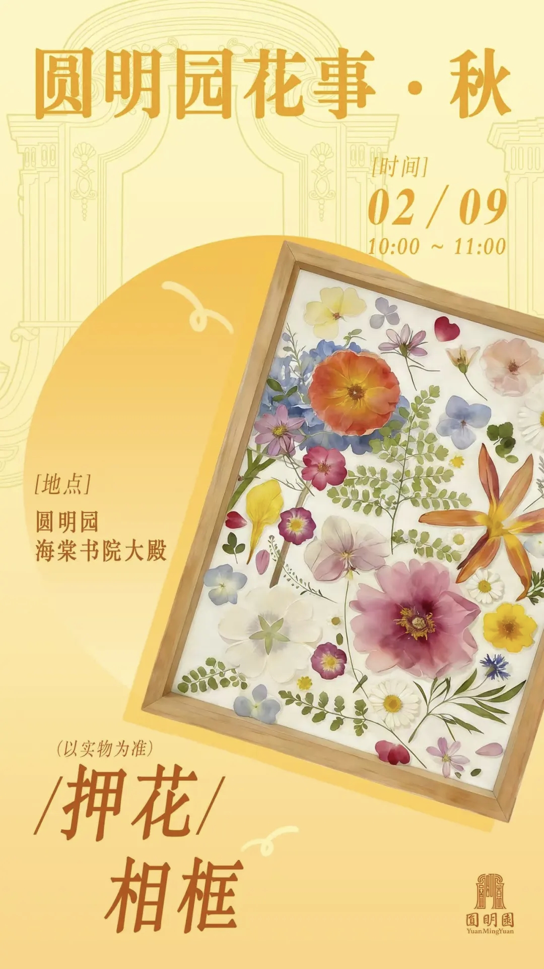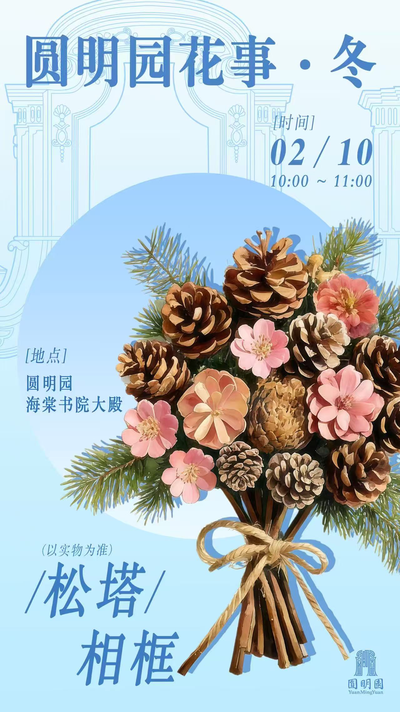 赴圆明花约,享手作清雅。2月7日至2月10日,圆明园海棠书院内将举办鲜花抱抱桶(春)、莲蓬挂件(夏)、手工押花(秋)、松塔相框(冬)四场手作体验课程。“鲜花抱抱桶”选取春季盛开的花卉作为花材,让参与者体验园艺插花的浪漫美学。“莲蓬挂件”选取圆明园夏天的莲蓬作为花材,用手工的温度将园林风物获得新生。“手工押花”选取圆明园秋日花海的格桑花、百日菊作为花材,通过押花工艺留存自然之美。“松塔相框”选取圆明园冬天的松塔作为花材,让自然生态在艺术中焕发童真活力。在专业老师的指导下,沉浸于手作魅力,定格自然园林之美,让御园花事在掌心绽放。