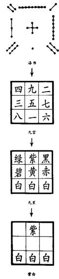 图1 九宫紫百图摘自王仲奋《浙江东阳民居》 论爻象 正殿居中央(按:当指九州清晏),以建皇极八方拱向。正北立自鸣钟楼,楼高三丈(按:从此楼位置与高度看当指「鱼跃鸢飞」楼),以应一白水星;西北乾地建佛楼,以应六白金星;东北艮方台榭楼阁系天市垣,以应八白土星,此三白之居北方也。正南九紫建立宫门,取向明出之意。第一层大宫门系延年金星(按:指圆明园大宫门),玉石桥北二宫门系六煞水星(按:指出入贤良门),大殿系贪狼吉星(按:指正大光明殿),以理事殿任何佐之(按:指勤政勤贤殿),木火相生,此九紫之居正南也。西南坤位房虽多,不宜高,以应土星(按:指「山高水长」南十三所或藻园);东南巽地乃文章之府(按;指皇子们居住、读书的洞天深处和如意馆),建立高楼以应太微,此二黑四绿分列九紫之左右也。正东震方田畴稻畦,且东接大海汪洋以润之,以应青阳发生之气,辛方树灯杆,巽纳辛以应天乙、太乙,庚方建平台,土来生金,此七赤三碧之所以得位也。 八卦以河图为体,取用则从洛书,戴九履一,左三右七,二四为肩,六八为足,皇极居中,八方朝供,《洪范》九范,实出乎此,此园内爻象具按九宫布列,岂敢妄议增减。” 此段文字载于中国第一历史档案馆编《清代档案史料—圆明园》一书中。其中年代、人物具经考证。它所依据的是“古代堪舆家(即风水先生)中的九星术派,依照洛书九宫的数理,以七种颜色和九颗星名(即贪狼、巨门、禄存、文曲、廉贞、武曲、破军等北斗七星和左扑辅、右弼两星)配合成一白、二黑、三碧、四绿、五黄、六白、七赤、八白、九紫。其中一白、六白、八白九紫对应的四颗星为吉星,其余五颗星均为凶星。”(摘自王仲奋《浙江东阳民居》) 张钟子在此段描述中提到了圆明园的东、西、南、北、中及四角的建筑。应该说正南、正北两处表述得十分清楚。尤其正南面宫殿一区张钟子说得尤为详尽。这一景区通常认为雍正三年后所建。而以张钟子的表述来看,此一区分明在雍正二年前已经存在。由此看来,雍正三年扩建的应是大宫门外的“分列朝属,俾侍值诸臣有视事之所”而不应包括宫殿一区。因为,此《启》已经提到了正南九紫的系延年金星大宫门,玉石桥和六煞水星二宫门出入贤良门,以及系贪狼吉星的正大光明大殿,佐之以理事的勤政亲贤殿。此九紫之居正南也。所以,此一区早在康熙朝时已经存在。 “东北艮方台榭楼阁系天市垣”应当是方壶胜境一区,「方壶胜境」为乾隆年间改建,此前在福海东北面一带有“海色初霞”[9]一景区,此后则再无记载。至于“天市垣”一词的含义,康熙帝曾有过一番考究,他说:“古人以天市垣为中国分野,朕始疑其说,细玩天球,合以地图,中国去赤道二十度至四十度,在谷雨、立夏、小满三节气上,天市垣亦去赤道二十度,恰与中国对照,始知古人分野之说确有所据,此又书之可信而不可信者也。”[10] 从论山水来看,这段关于山水的描述完全符合现存山形水系以及《日下旧闻考》所载“圆明园之水发源玉泉山,由西马厂入进水闸。支流派衍,至园内日天琳宇、柳浪闻莺处之响水口,水势遂分,西北高而东南低……[11]”。至于“会诸水东注大海”的大海指的就是福海。 关于圆明园的山形水系据法国人王致诚亲眼所见:园内“以人工垒石成小山,有高二丈至五六丈者,联贯而成无数小山谷。谷之底处清水注之,以小涧引注它处。小者为池,大者为海”。[12]需要说明的是王致诚作为一个精通建筑设计的画家、教士,他的尺寸感是非常准的,他说山有五六丈高(也有译成五六十法尺)应该是可信的。将它与雍正二年张钟子等实地查看到的“园内山起于西北,高卑大小,曲折婉转,俱趣东南巽地”相对照则得出,如此巧妙而浩大的工程——圆明园的山形水系至雍正二年之前业已完成。而之所以说是“浩大的工程”,是因为这一带本是无山的湿地,故有“海淀”之称。而它巨大多姿的“虽由人作,宛自天开”的山峦完全是由人工堆筑而成[13]。 以上通过张钟子等的实地勘舆的记录,再现了雍正二年以前圆明园的实际情况。虽然,此后圆明园历经增扩建,但此时圆明三园中的圆明园的山形水系与大部分的园林景观已经完成。而如果此时山形水系与园林景观已经形成,那么它绝不是在雍正元年至雍正二年间完成的,而是在康熙六十一年前就完成了。因为,圆明园作为清朝最大的人工山水园林,其工程量之巨大,绝非一两年所能完成的了。此外,就建筑景区布局设计来看,早期的圆明园即是遵循“爻象具按九宫布列”的风水理论而设计,气象之大早已有之。 (二)康熙六十一年前圆明园的规模 然而,同样以此为据,还有一种观点认为这是圆明园开始扩建前的规划。如果说可能因为张钟子等查看圆明园风水启对雍正二年之前的情形描述的过于笼统之故而难于定论的话,那么,我们认为收录于《雍正御制诗文集》卷二十六中的“雍邸集”之六的“园景十二咏”诗中的圆明园十二景的存在则毋庸置疑。因为,这是雍亲王雍邸园居时所写。那么这十二景的位置在哪?所涵盖的范围有多大? 1、关于“园景十二咏”所咏园景所在的探究 首先,此“园景十二咏”分别咏的是:深柳读书堂、竹子院、梧桐院、葡萄院、桃花坞、耕织轩、菜圃、牡丹台、金鱼池、壶中天、涧阁、莲花池。对于这十二园景据张恩荫先生的考证认为:“可以确知其中十